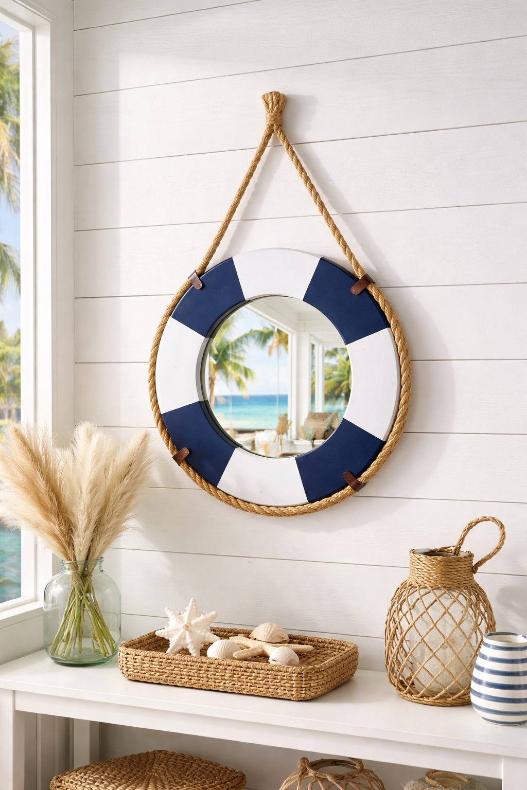 Espelho Bóia em Madeira Azul Marinho com Corda Grande Decoração Náutica Praia